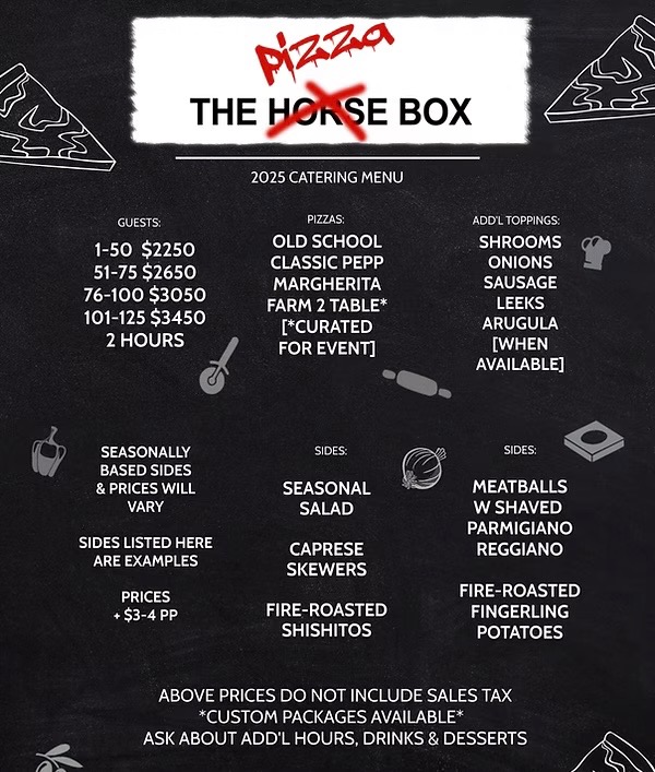 For Catskills events, we bring our famous horse pizza trailer and cook everything fresh on-site. For NYC and other catered events, food is delivered and served without the trailer.